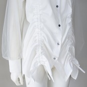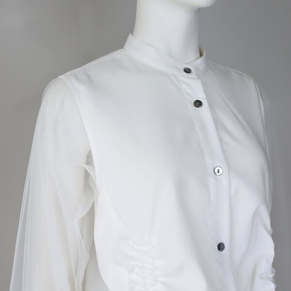 袖にはチュールを施し、前身ごろは調整可能なギャザーデザインがポイント。
