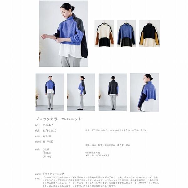 【 Lallia Mu 】ラリアムー ウール 20% ブロックカラー 2Way 前後着用 タートルネック ニット 春秋冬 レディース [2514472-OFF]