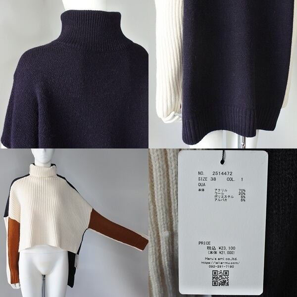 【 Lallia Mu 】ラリアムー ウール 20% ブロックカラー 2Way 前後着用 タートルネック ニット 春秋冬 レディース