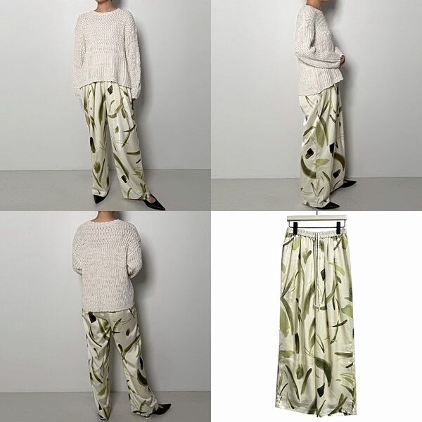 手書き風の大判な抽象柄が目を引く、サテンタックパンツです。