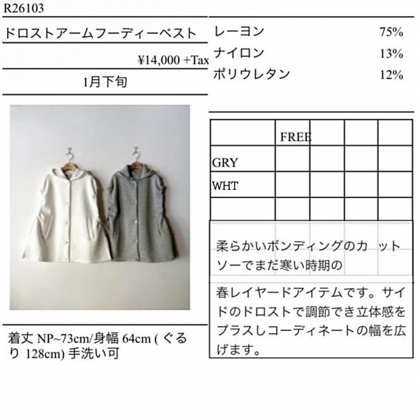 【 RILATO 】 リラート きれいめ ボンディング ドロストアーム フーディ ベスト ジレ 春秋 レディース [R26103-WHT]