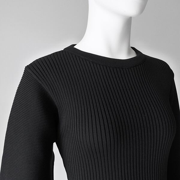 やや厚手の糸で作られ、身頃はリブ編みで裾と編地を変えることで袖のボリュームや